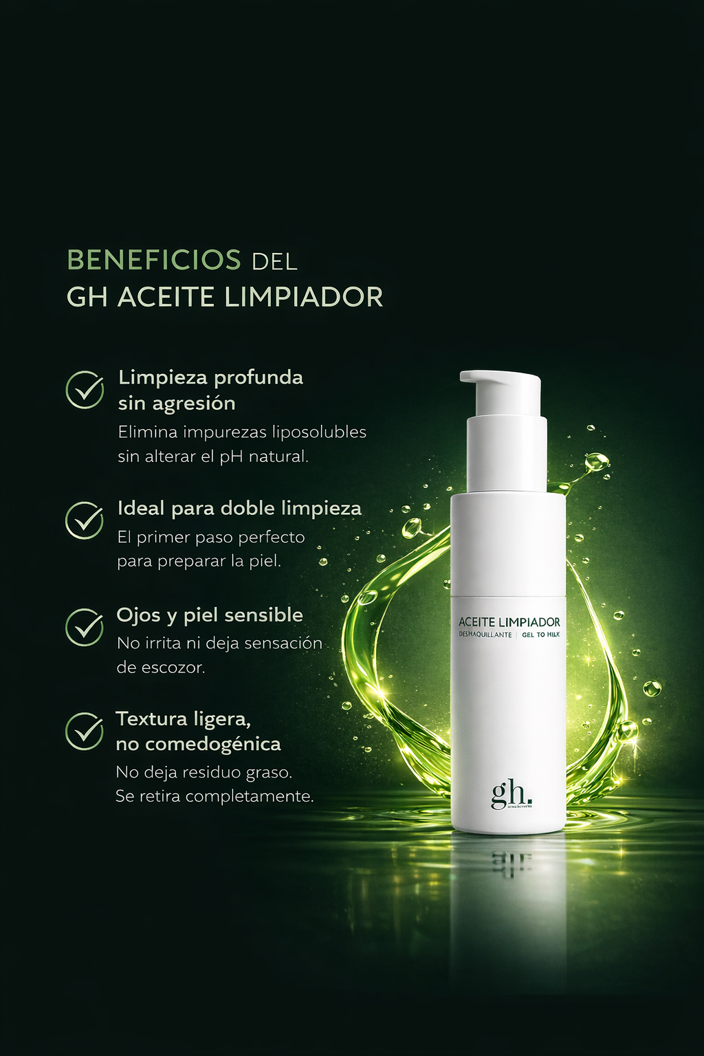 El GH Aceite Limpiador Desmaquillante Rostro y Ojos es un aceite limpiador facial de alto rendimiento formulado para eliminar maquillaje (incluso waterproof), filtros solares, exceso de grasa y contaminación, respetando la barrera cutánea.